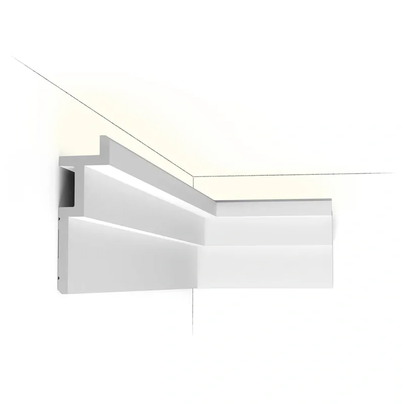 Tento čistý moderní profil z řady Steps lze také použít k zakrytí LED osvětlení. Zkosené hrany na horní a spodní straně vytvářejí další jemné stínování. Designér Orio Tonini.